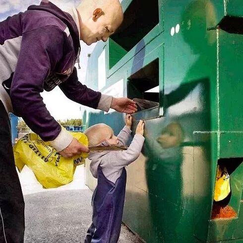 一位瑞典父亲教孩子把垃圾装入正确的垃圾箱中。